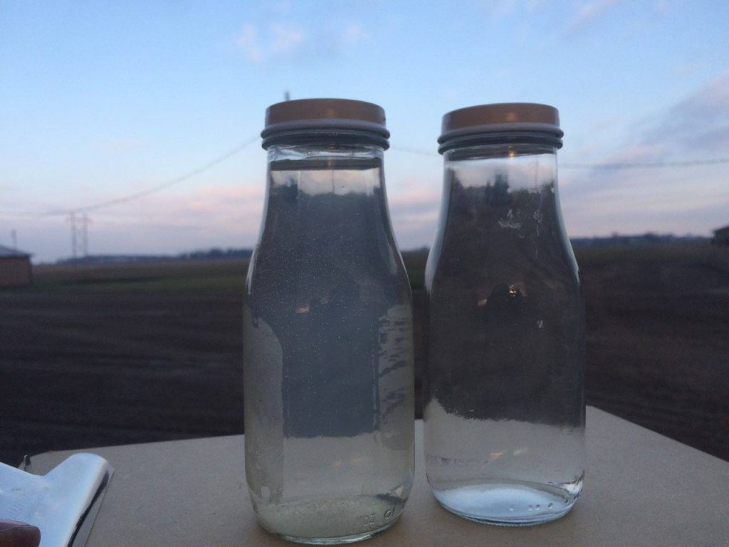 Here is a picture of water that was collected out of the tile outlet in the ditch after a rain. The one on the left is out of a chisel-plowed field and the one on the right is out of our field with cover crop in it.