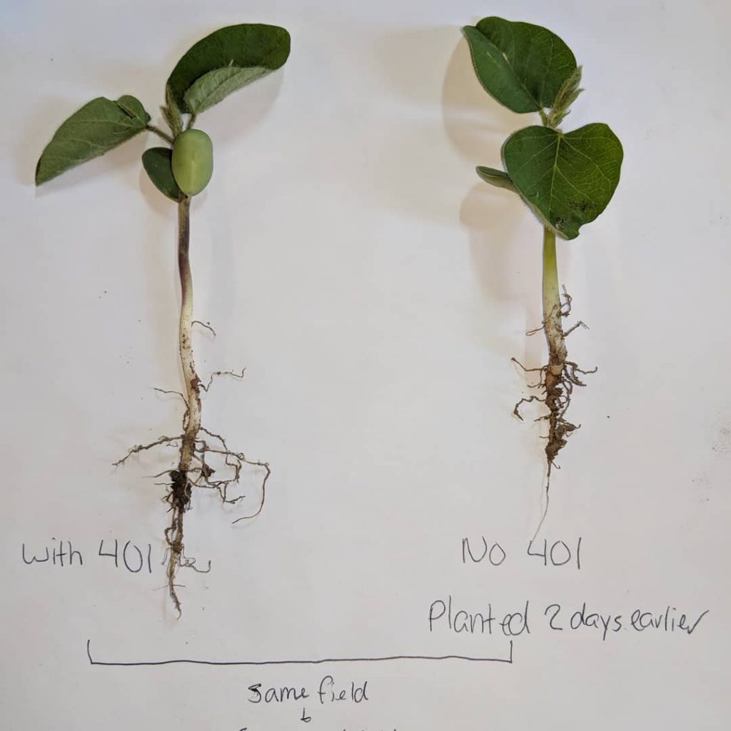 This is a picture of using 401 infurrow to the left and no popup on the right. Also the bean on the left that had 401 was planted two days later than the bean on the right.