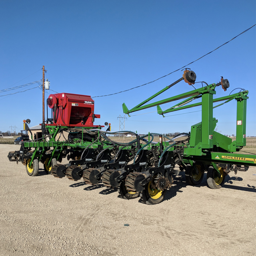 This is a picture of us planting our beans in fifteen inch rows. Between our thirty inch cover crop rows that we seeded with our striptill bar.